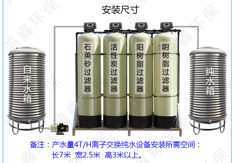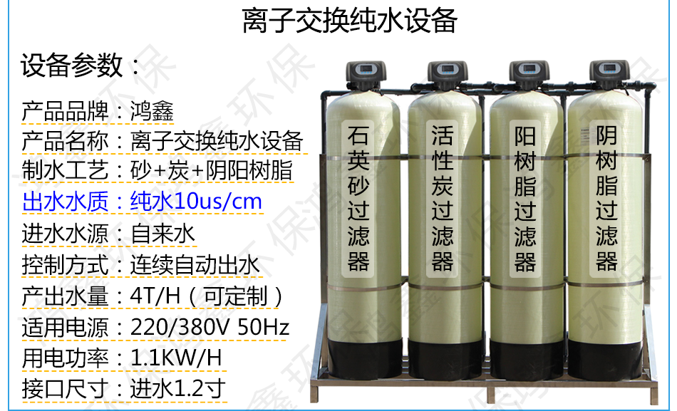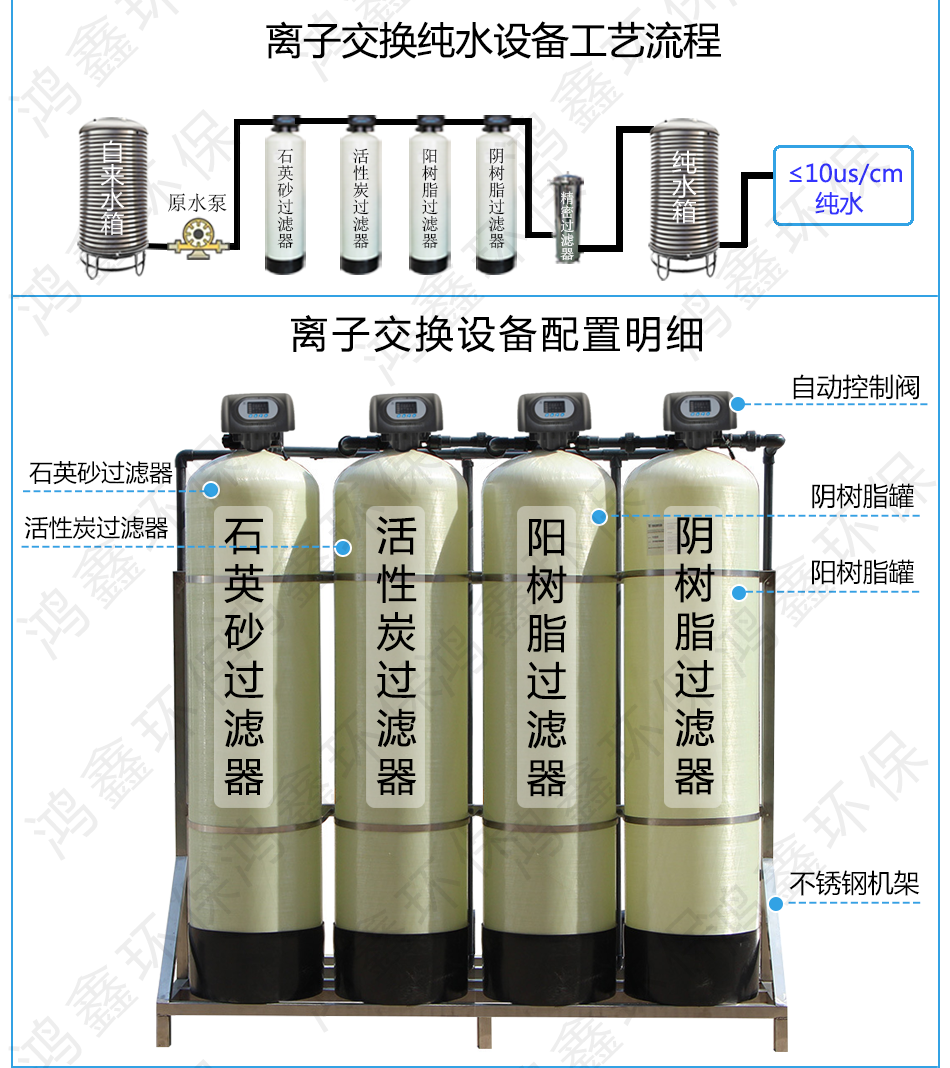 離子交換純水設(shè)備是傳統(tǒng)的去離子水設(shè)備,適應(yīng)處理自來(lái)水,設(shè)備造價(jià)相對(duì)較低,出水量大、,非常適合于用水量大的產(chǎn)線,它的制水工藝是由原水箱+原水泵+石英砂過濾器+活性炭過濾器+陰樹脂過濾器+陽(yáng)樹脂過濾器+純水箱。