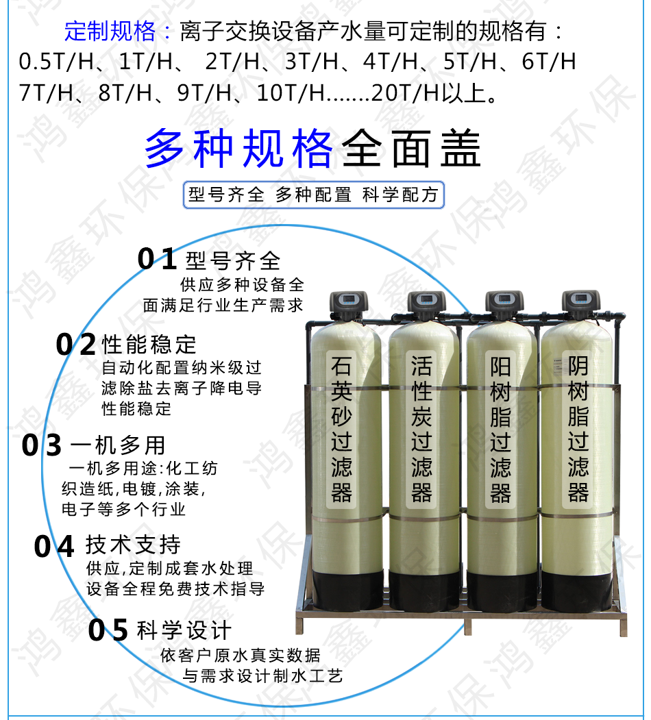 鴻鑫環(huán)保設(shè)備15年專注于水處理凈化工藝的設(shè)計(jì)、生產(chǎn)銷售安裝、設(shè)備維護(hù)、設(shè)備出租、技術(shù)服務(wù)為一體的一條龍服務(wù)企業(yè),所有的設(shè)備可依據(jù)客戶需求來(lái)定制,定制的設(shè)備類型有:市政生活用水處理設(shè)備、直飲純凈水設(shè)備、超濾處理設(shè)備、ro反滲透純水設(shè)備,離子交換純水設(shè)備、EDI超純水設(shè)備、軟化水處理設(shè)備、RO濃水回收設(shè)備、中水回用設(shè)備。