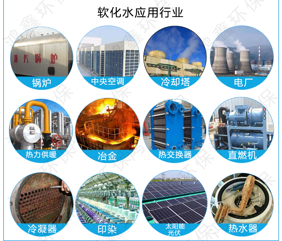 軟化水設備在軟化水的過程中,不會降低水中的總含鹽量,所以在熱水鍋爐系統(tǒng)、熱交換系統(tǒng)、工業(yè)冷卻系統(tǒng)、中央空調系統(tǒng)以及其他用水設備系統(tǒng)中都有廣泛的應用。