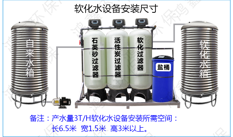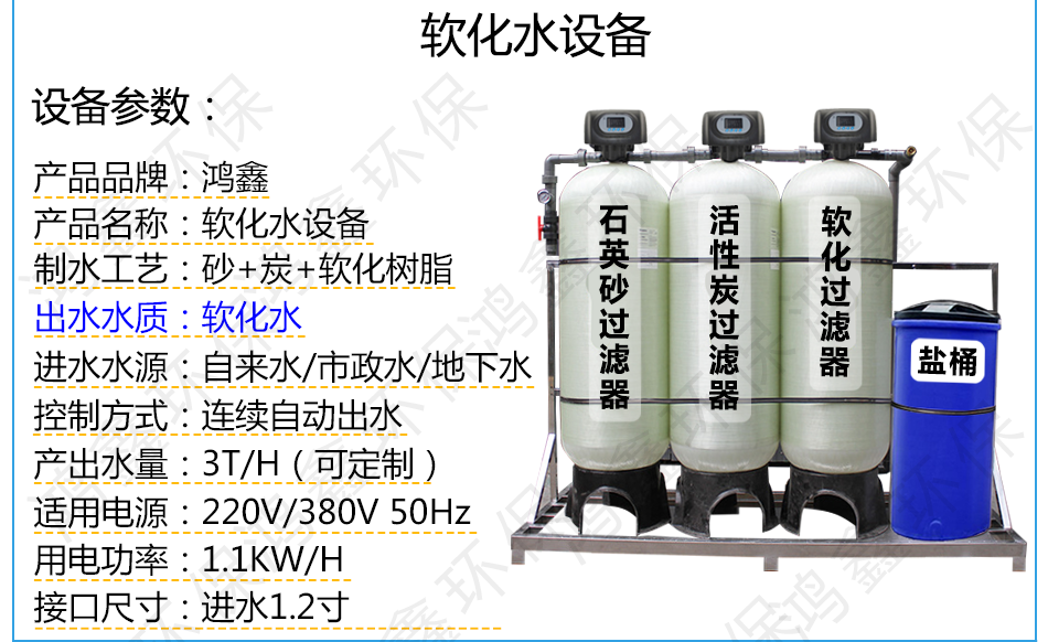 軟化水設備主要去除水中的鈣、鎂離子,降低水的硬度,使硬水變?yōu)檐浰?,主要是利用離子交換劑將水中的Ca2+、Mg+2轉換成Na+,其他陰離子成分不改變來達到軟化的目的。