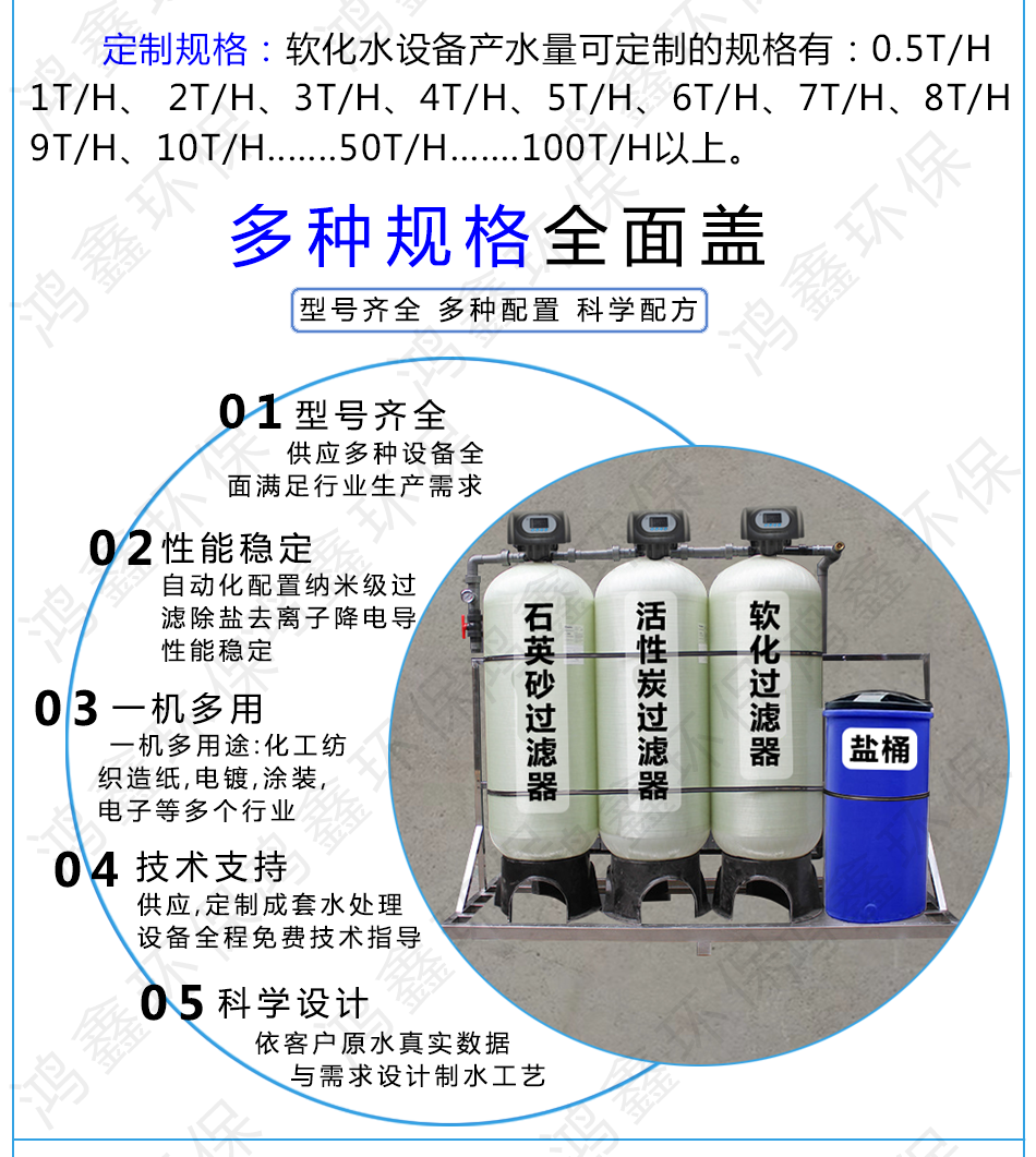 鴻鑫環(huán)保設備15年專注于水處理凈化工藝的設計、生產銷售安裝、設備維護、設備出租、技術服務為一體的一條龍服務企業(yè),所有的設備可依據客戶需求來定制,定制的設備類型有:市政生活用水處理設備、直飲純凈水設備、超濾處理設備、ro反滲透純水設備,離子交換純水設備、EDI超純水設備、軟化水處理設備、RO濃水回收設備、中水回用設備。