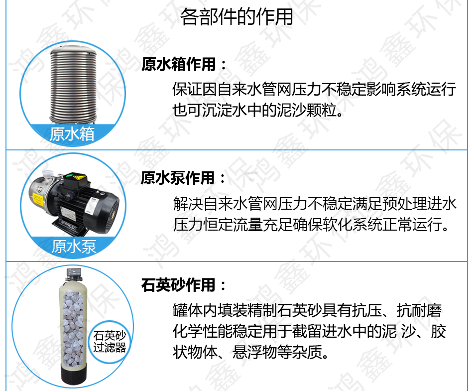 軟化水設備主要去除水中的鈣、鎂離子,降低水的硬度,使硬水變?yōu)檐浰?,主要是利用離子交換劑將水中的Ca2+、Mg+2轉換成Na+,其他陰離子成分不改變來達到軟化的目。