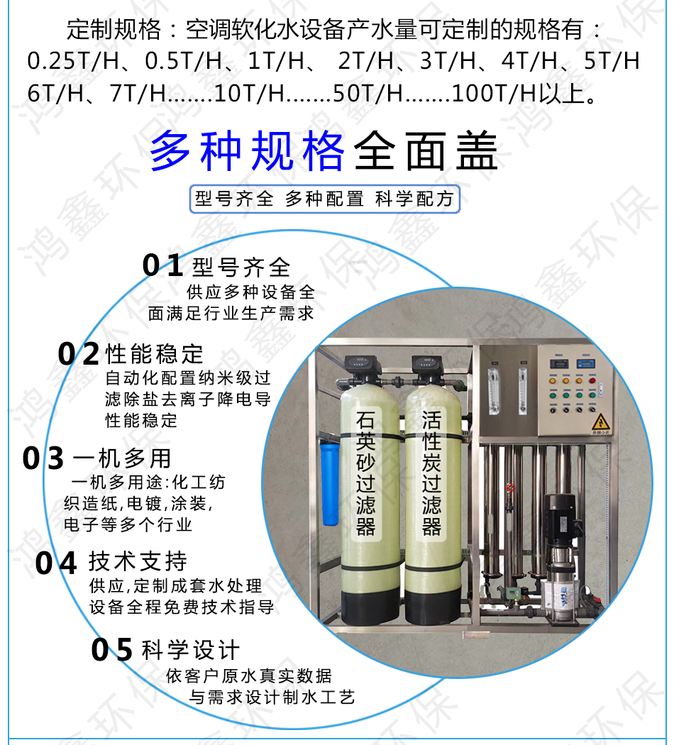空調(diào)軟化水處理設(shè)備是專門去除水中的鈣鎂離子,降低原水的硬度,去除有效率高達(dá)98.5%以上。
