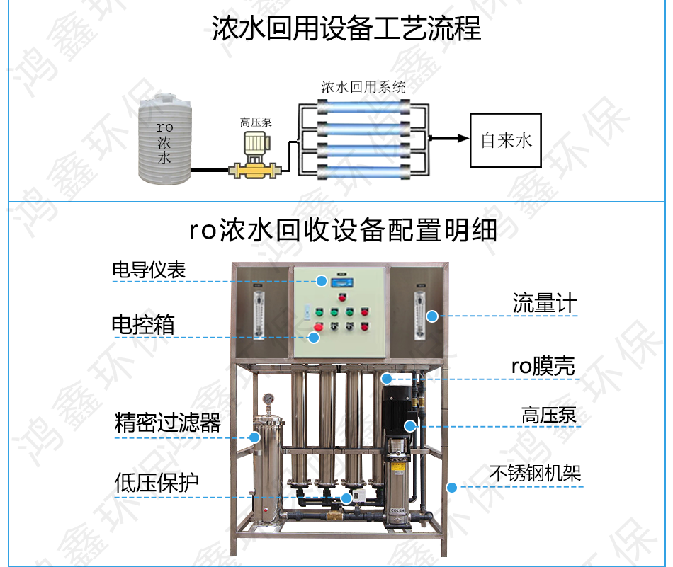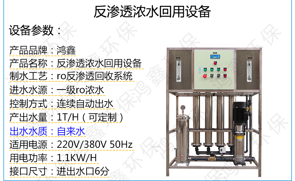 RO濃水回收設(shè)備是專門處理ro反滲透純水設(shè)備的一級濃水,將一級RO濃水處理后變成自來水混入原水中再給反滲透設(shè)備當自來水用,回收率在60%~70%之間。像這個1T/H的濃水回用設(shè)備每小時可處理濃水1.5噸,也就是1噸濃水處理后有0.6T~0.7T變成自來水回到純水設(shè)備的自來水箱中當自來水再用。