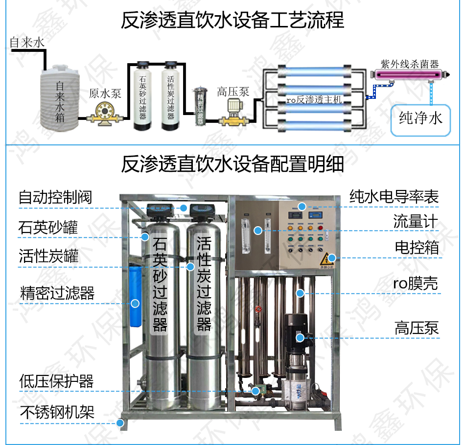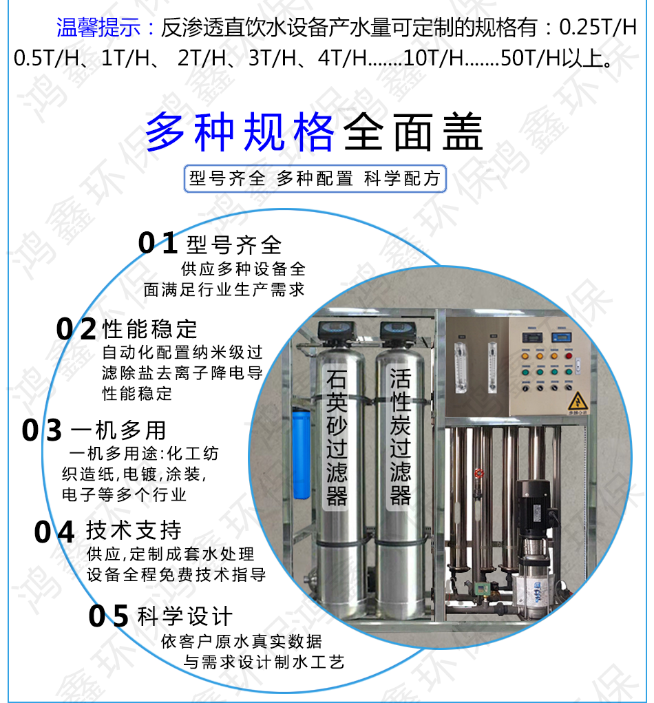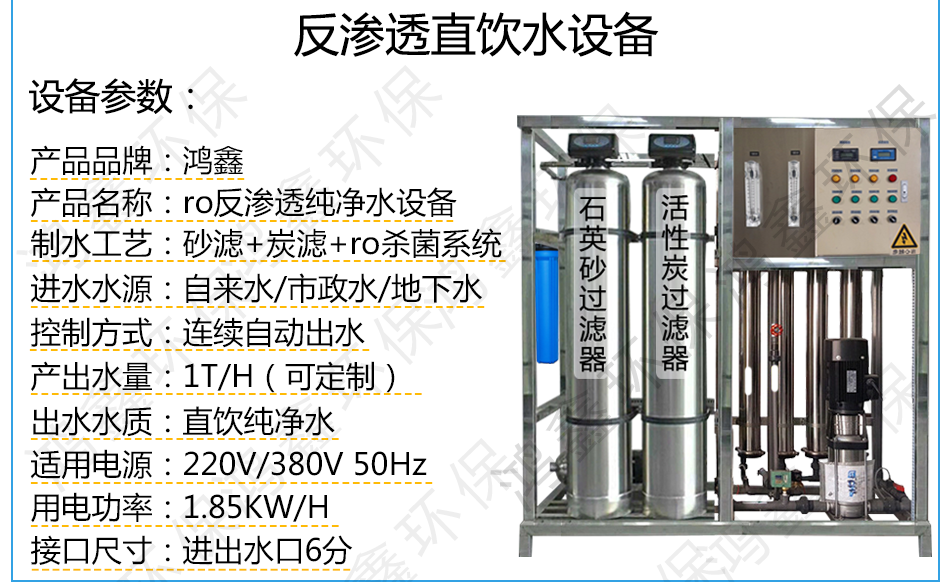 鴻鑫環(huán)保專業(yè)定制:市政生活用水處理設(shè)備、直飲純凈水設(shè)備超濾水處理設(shè)備、ro反滲透純水設(shè)備,離子交換純水設(shè)備、EDI超純水設(shè)備、軟化水處理設(shè)備、RO濃水回收設(shè)備、中水回用設(shè)備。