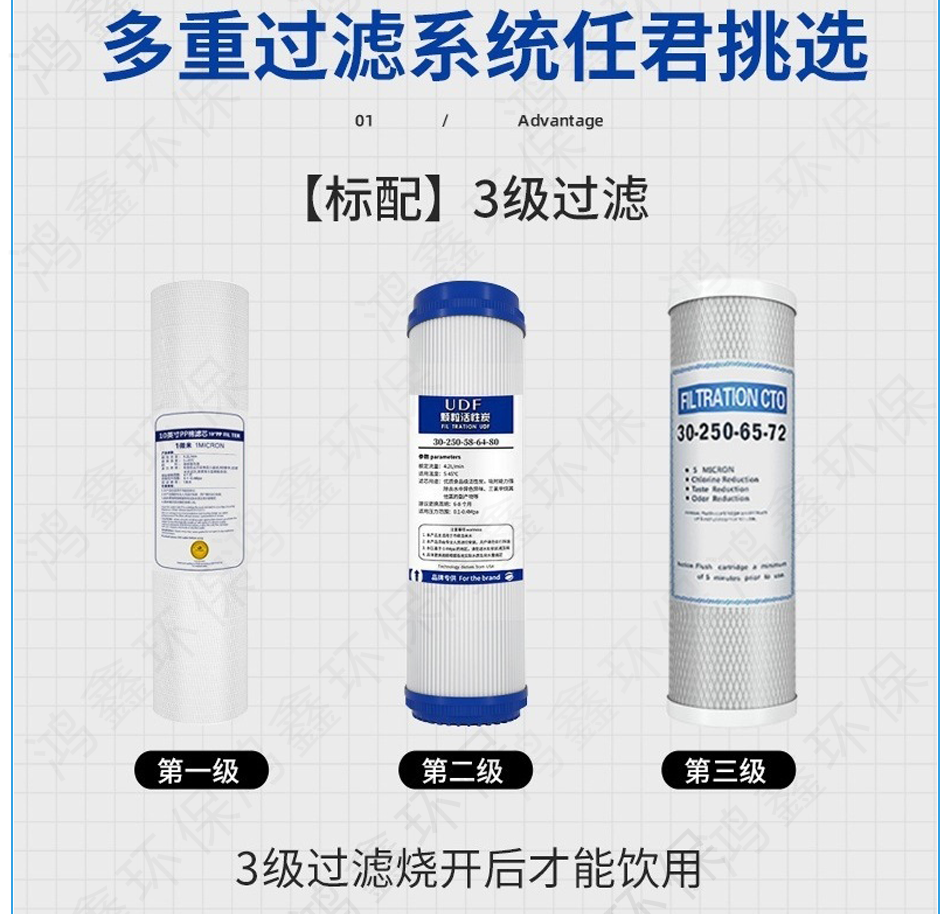 3:三級濾芯是用壓縮活性炭濾芯(CTO炭)進(jìn)行深度吸附水中余氯、異味、懸浮物等有害物質(zhì),進(jìn)一步凈化水質(zhì))。