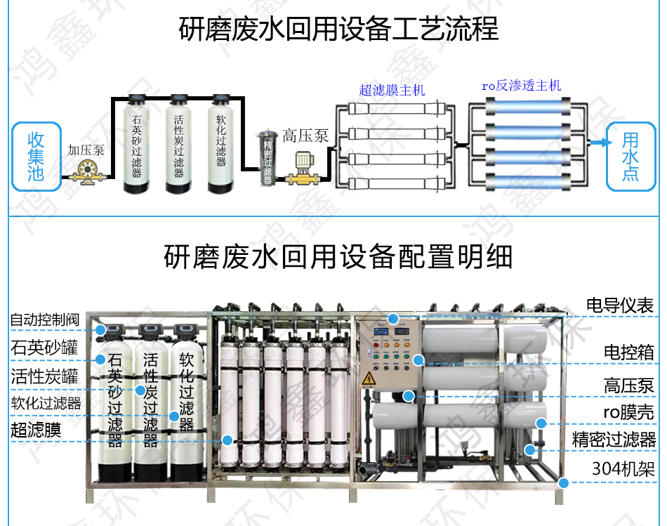 廢水收集池→PH值調(diào)節(jié)→絮凝→斜板沉淀→清水池→石英砂過濾→活性炭過濾→超濾→RO反滲透系統(tǒng)→回用水箱→回到使用點