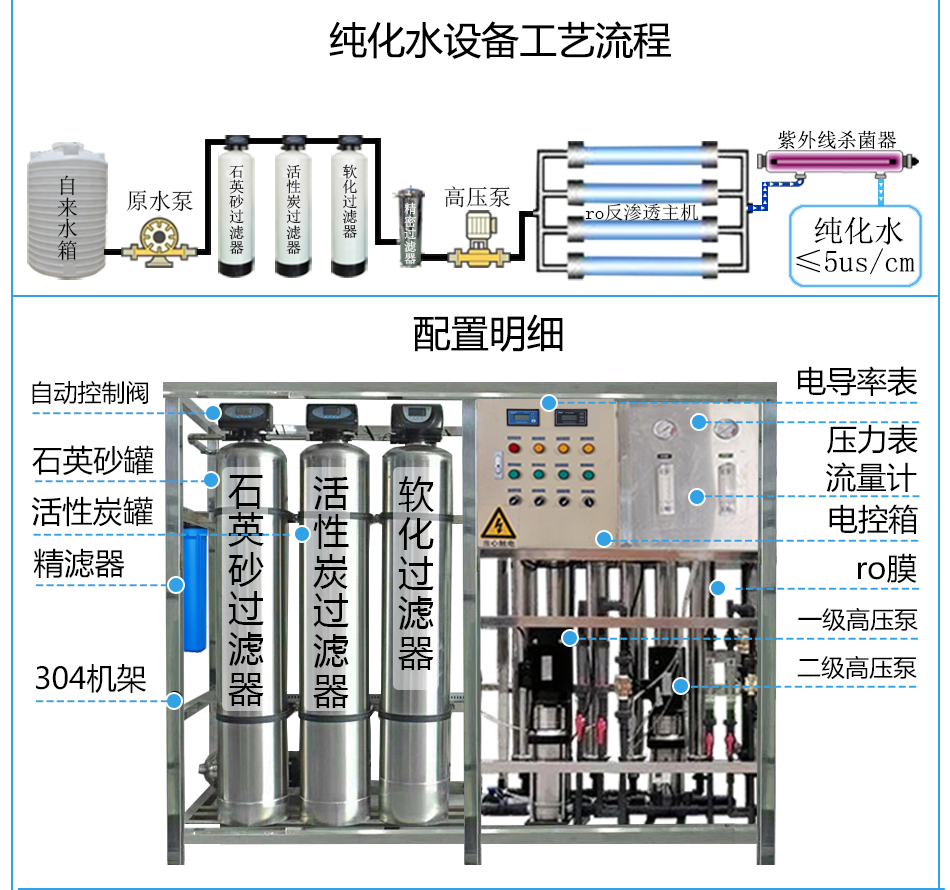 原水箱+原水泵+石英砂過濾器+活性炭過濾器+保安過濾器+ro反滲透系統(tǒng)+紫外線殺菌器+無菌水箱。