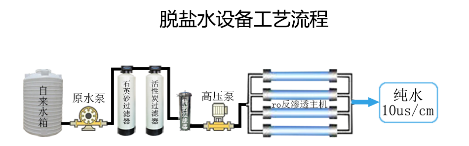 脫鹽水處理設備的工藝流程:原水箱→原水泵→石英砂過濾器→活性碳過濾器→保安過濾器→RO反滲透系統(tǒng)→純水箱→用水點。