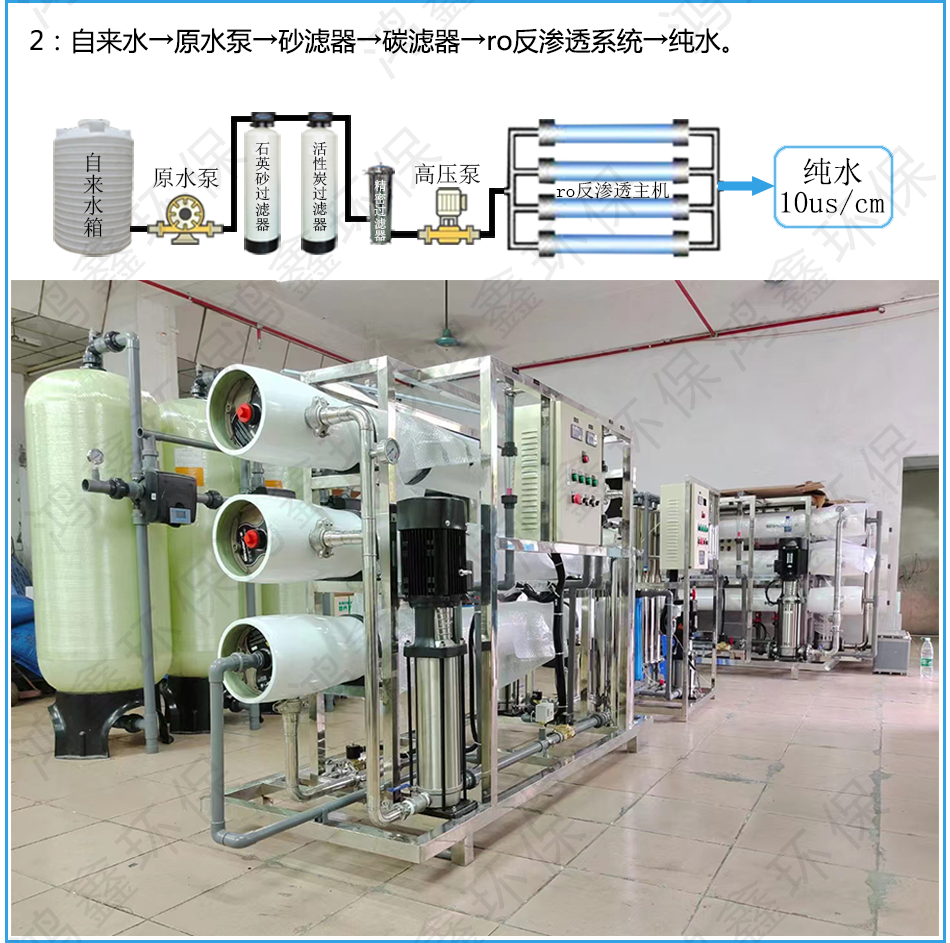 2:自來水→原水泵→砂濾器→碳濾器→ro反滲透系統(tǒng)→純水。