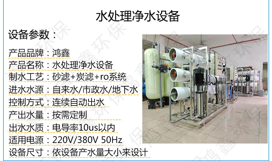 鴻鑫環(huán)保設(shè)備15年專注于水處理凈化工藝的設(shè)計(jì)、生產(chǎn)銷售安裝、設(shè)備維護(hù)、設(shè)備出租、技術(shù)服務(wù)為一體的一條龍服務(wù)企業(yè),所有的設(shè)備可依據(jù)客戶需求來定制,定制的設(shè)備類型有:市政生活用水處理設(shè)備、直飲純凈水設(shè)備、超濾處理設(shè)備、ro反滲透純水設(shè)備,離子交換純水設(shè)備、EDI超純水設(shè)備、軟化水處理設(shè)備、RO濃水回收設(shè)備、中水回用設(shè)備。