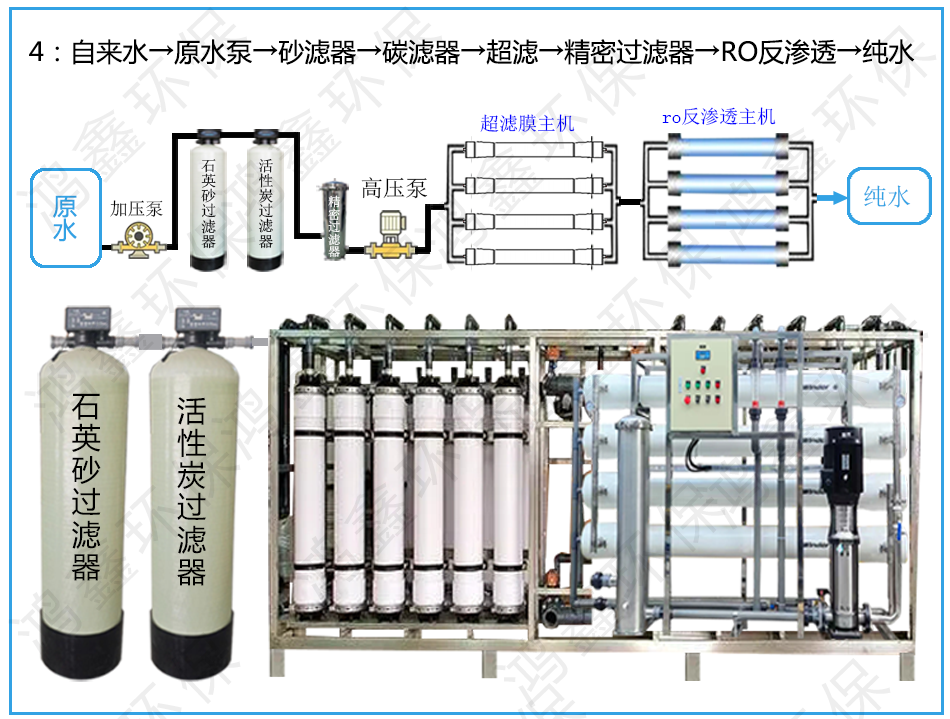 2:自來水→原水泵→砂濾器→碳濾器→ro反滲透系統(tǒng)→純水(≤10us/cm)。