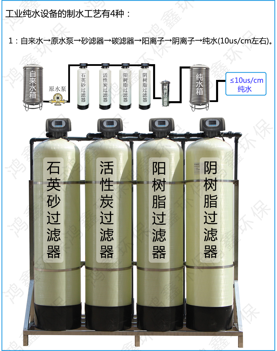 1:自來水→原水泵→砂濾器→碳濾器→陽離子→陰離子→純水(10us/cm左右)。