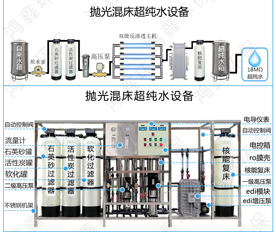 4:EDI超純水+核能樹脂:石英砂過濾器+活性炭過濾器+精密過濾器+雙級ro反滲透系統(tǒng)+EDI系統(tǒng)+核能樹脂=超純水(電阻率18.2MΩ)。